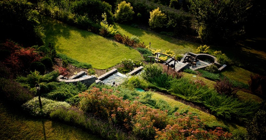 Zahradní pokoj s přímým vstupem do kaskádovité zahrady a velkou manželskou postelí.